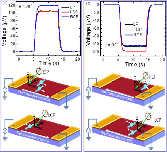 通過(guò)阿哈拉諾夫玻姆效應(yīng)(Aharonov−Bohm,AB效應(yīng),證明電磁場(chǎng)的矢勢(shì)有直接的可觀測(cè)的物理效應(yīng))和舒勃尼科夫―德哈斯效應(yīng)(Shubnikov-de Haas,SdH振蕩,固體材料的電阻(磁阻)隨磁場(chǎng)的倒數(shù)呈周期性振蕩的現(xiàn)象)測(cè)出拓?fù)浣^緣體表面的狄拉克費(fèi)米子(滿足狄拉克方程的費(fèi)米子,費(fèi)米子即自旋為半整數(shù)(1/2,3/2…)的粒子)性質(zhì)。使用圓偏振光(CPL)來(lái)選擇性激發(fā)硒化鉍(Bi2Se3)表面態(tài)電子,產(chǎn)生自旋極化的表面態(tài),由于自旋方向與動(dòng)量方向的鎖定關(guān)系,樣品中會(huì)產(chǎn)生電子定向運(yùn)動(dòng)的光電流。同時(shí)也觀測(cè)到Bi2Se3中圓偏振光增強(qiáng)的光熱電效應(yīng)。該實(shí)驗(yàn)結(jié)果有望用于自旋極化的電流源的產(chǎn)生,將進(jìn)一步推動(dòng)對(duì)自旋電子學(xué)在生活中的應(yīng)用。
