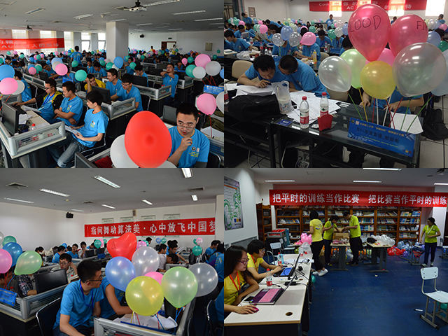 比賽從上午9點(diǎn)30分開始,比賽用時5個小時;共設(shè)置12道題目,采用ACM評分規(guī)則,程序正誤由Online Judge系統(tǒng)自動判評。長達(dá)5個小時的激烈角逐,不僅是腦力的比拼,而且是耐力的較量。參賽選手分工明確、協(xié)調(diào)統(tǒng)一,充分發(fā)揮自身優(yōu)勢,以團(tuán)隊的優(yōu)勢攻堅克難。正是由于選手們的出色表現(xiàn),比賽現(xiàn)場升起一個又一個彩球。