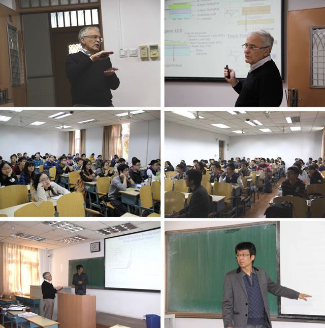 在訪問期間,葛內(nèi)德副校長及隨行助手賈會平研究員在3號樓302教室為光電學(xué)院光電信息工程專業(yè)本科四年級同學(xué)講授了《光電顯示技術(shù)》課程中的《OLED顯示技術(shù)》部分。學(xué)生們認(rèn)為葛內(nèi)德教授上課充滿激情,詼諧生動(dòng),講課內(nèi)容豐富,當(dāng)學(xué)生們了解到OLED顯示技術(shù)發(fā)展奠基人鄧青云博士為華人時(shí),學(xué)生產(chǎn)生了極大的自豪感。賈會平研究員和唐義副教授對課件的關(guān)鍵詞語進(jìn)行了中文對照,并就課程中的部分難點(diǎn)和重點(diǎn)問題進(jìn)行翻譯和解釋。