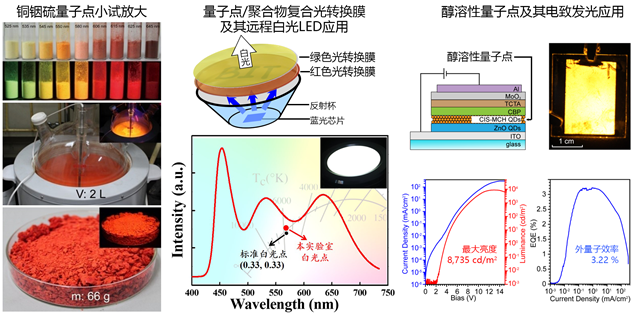 圖1 CuInS2量子點的小試放大及其遠程白光LED燈具和電致發(fā)光顯示應用