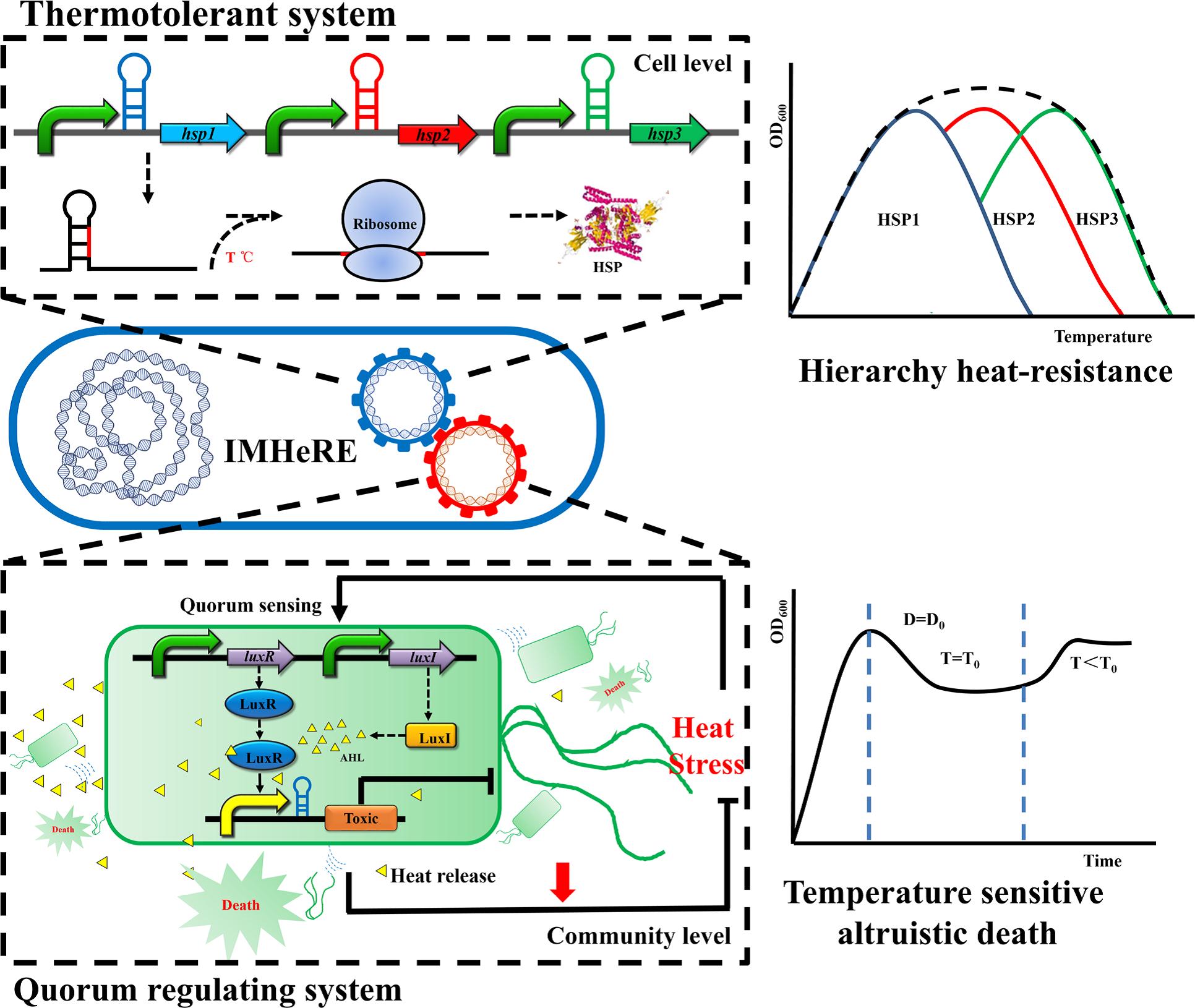 。。微生物智能熱量調(diào)節(jié)引擎的設(shè)計及應(yīng)用(IMHeRE),創(chuàng)造性地實現(xiàn)并大幅度提高了大腸桿菌的耐熱能力。IMHeRE主要包括微生物耐熱基因線路和數(shù)量調(diào)控基因線路。耐熱線路包括從嗜熱微生物中篩選得到的熱激蛋白(HSPs)作為耐熱功能元件,以及人工設(shè)計的RNA溫度響應(yīng)開關(guān)作為調(diào)控元件,利用對不同溫度響應(yīng)的RNA溫度響應(yīng)開關(guān)調(diào)控在不同溫度下效果最佳的HSPs實現(xiàn)了大腸桿菌的梯級耐熱,成功地將大腸桿菌的最適生長溫度拓寬到了37-40℃。數(shù)量調(diào)控線路則利用微生物群體感應(yīng)系統(tǒng)和RNA溫度響應(yīng)設(shè)計的“與”門開關(guān),同時響應(yīng)溫度和細(xì)胞密度兩個參數(shù)來動態(tài)開啟安全可控的毒性-抗毒性系統(tǒng)(TA),實現(xiàn)微生物的利他性程序化死亡,減少了代謝熱的釋放同時提高了營養(yǎng)物質(zhì)的利用率, 從而在菌群層面上提高了微生物適應(yīng)熱脅迫的能力。最后,通過兩個系統(tǒng)的協(xié)同作用,IMHeRE提高了大腸桿菌對特定高溫以及高溫波動的適應(yīng)性與魯棒性。將該引擎應(yīng)用于賴氨酸40℃高溫發(fā)酵,發(fā)現(xiàn)賴氨酸產(chǎn)量較對照組提高了5倍,IMHeRE顯著的改善了賴氨酸菌株在高溫下的生產(chǎn)能力,提高了生產(chǎn)效率、降低控溫能耗。另外,由于提高了發(fā)酵溫度,還可以節(jié)省糖化步驟之后的冷卻費用。