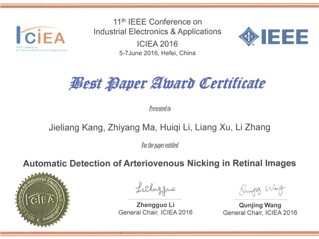 李慧琦教授課題組長期致力于醫(yī)學(xué)圖像處理與計算機(jī)輔助診斷研究,獲獎?wù)撐氖顷P(guān)于眼底圖中動靜脈交叉壓迫的自動檢測研究。動靜脈交叉壓迫檢測對于高血壓和動脈硬化的早期診斷具有重要醫(yī)學(xué)研究價值。本論文是與北京同仁醫(yī)院北京眼科研究所合作發(fā)表的,我校為第一作者單位,第一、二、三作者為李慧琦教授課題組研究生康杰靚、馬志揚(yáng)及李慧琦教授,第四、五作者徐亮、張莉為同仁醫(yī)院合作醫(yī)生。