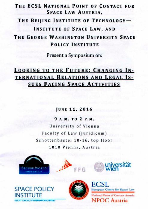 2016年6月11日,我??臻g法研究所與喬治華盛頓大學空間政策研究所在維也納聯(lián)合舉辦題為“面向未來:變化中的國際關系和空間法問題”國際學術會議。參加本次大會的有來自美國、俄羅斯、奧地利、日本、德國等20多個國家的60位有關空間法律與政策的專家和政府官員。我國外交部參加聯(lián)合國外空委第59屆會議的代表團成員也參加了會議。會議由歐洲空間法中心奧地利聯(lián)系點維也納大學法學院負責承辦。