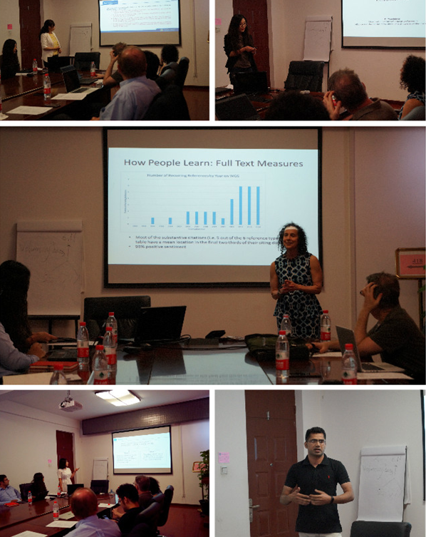 Jan Youtie教授做題為“Cross borders: A citation analysis of connections between Cognitive Science and Educational Research and the fields in between”的學(xué)術(shù)報(bào)告。郭穎老師以 “A Systematic Method for Technology Assessment: Illustrated for ‘Big Data’”為題,介紹了其以“大數(shù)據(jù)”行業(yè)為案例開展技術(shù)評(píng)估的最新研究進(jìn)展。李燕超博士做題為“Differential Outcomes to Strategy: Exploring Factors Shaping Returns to Innovation Policy in China and Russia”的報(bào)告,介紹了中俄創(chuàng)新政策的對(duì)比研究。此外,來(lái)自知識(shí)管理與數(shù)據(jù)分析實(shí)驗(yàn)室博士生王志楠、Omer分別以“The research scope evolutions of leading teams in GMO field: a bibliometrics analysis”和“Factors sets interaction(FSI): a case study in brain cancer”為題進(jìn)行了精彩的報(bào)告。