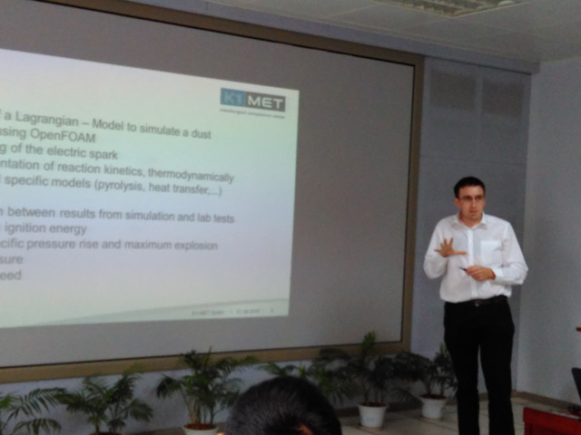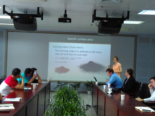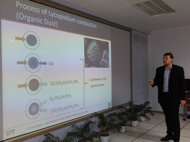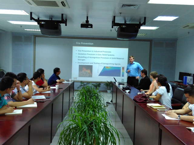 Kern Hannes 教授首先介紹了他所領(lǐng)導(dǎo)的團隊近年來所取得的研究成果,并對工業(yè)爆炸安全和應(yīng)急救援等發(fā)展趨勢和科學(xué)前沿進行了詳細的闡述。3位博士分別從計算建模、數(shù)值模擬和實驗測試等方面分別介紹了不同尺度的粉塵顆粒的擴散、燃燒、爆炸等現(xiàn)象,分析了粉塵爆炸的壓力、溫度隨時間的演變規(guī)律。他們的學(xué)術(shù)研究具有前沿性,研究成果在奧地利的煤礦和化工企業(yè)中得到了很好的應(yīng)用。報告內(nèi)容詳盡且精彩,贏得了參會師生的強烈興趣,并進行了熱烈的討論。