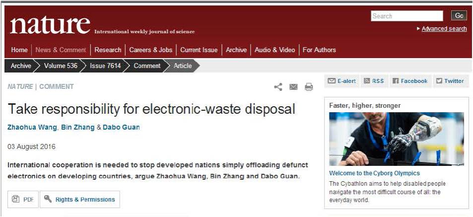 北京理工大學(xué)王兆華教授和張斌博士與英國(guó)東英吉利大學(xué)Dabo Guan教授在前期工作的基礎(chǔ)上,分析了全球電子廢棄物流向和回收處置不均衡的問題。研究成果“Take Responsibility for Electronic-waste disposal”發(fā)表于Nature的Comment欄目(文章鏈接:http://www.nature.com/news/take-responsibility-for-electronic-waste-disposal-1.20345),這也是中國(guó)學(xué)者首次在Nature上探討電子廢棄物回收處置話題。