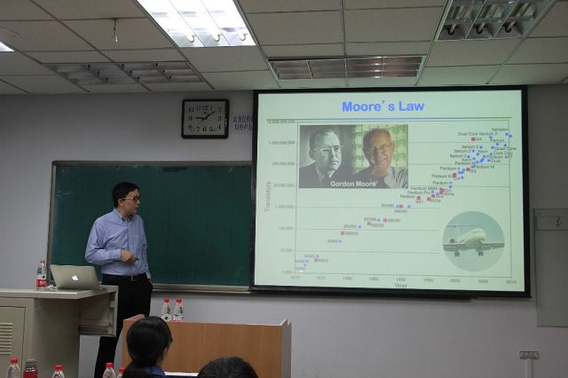 段鑲鋒教授首先從半導(dǎo)體技術(shù)的發(fā)展出發(fā)指出技術(shù)革新對材料性能的特殊要求,提出二維材料的一些優(yōu)異性能可彌補目前主流硅材料的瓶頸。隨后以石墨烯和二硫化鉬材料為例,提出了通過范德華作用力對材料進行有效集成的概念,介紹了近年來其課題組在該研究領(lǐng)域的一些極富創(chuàng)新性的研究工作。同時段教授也介紹了課題組在新型納米器件結(jié)構(gòu)設(shè)計、二維材料在光電納米器件中的應(yīng)用等方面做的創(chuàng)新成果。整個報告過程中,段教授邏輯嚴謹,深入淺出的講解了他們在這一領(lǐng)域的研究思路和成果。