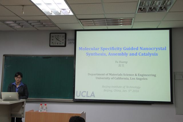 黃昱教授的報告同樣精彩。她首先提出將生物仿生方法運用到納米晶體形貌可控制備中的概念,通過噬菌體展示技術(shù)篩選出與靶向材料表面甚至特定晶面有特異吸附作用的生物分子,并利用篩選出的生物分子對納米晶的生長進行精確調(diào)控進而控制納米晶體的形貌,通過這種方法可以設(shè)計并合成具有高催化活性的催化劑。此外,黃昱教授進一步闡述通過組分和表面調(diào)控以獲得高活性的催化劑的方法和機理。黃昱又對該研究方向未來的發(fā)展、機遇和挑戰(zhàn)進行了展望,并與在場師生進行了熱烈的討論交流。段、黃兩位教授的到訪,對北理工材料相關(guān)領(lǐng)域的國際化交流起到了很大的推動作用,也為UCLA和北京理工大學(xué)的文化學(xué)術(shù)交流建起了一座溝通的橋梁。