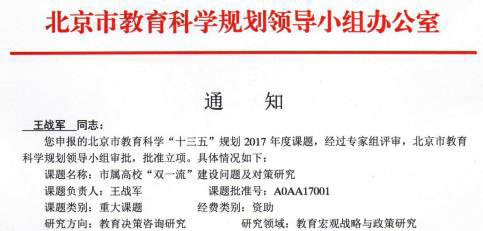 2017年6月6日,北京市教育科學(xué)規(guī)劃領(lǐng)導(dǎo)小組審批立項(xiàng)了北京市教育科學(xué)“十三五”規(guī)劃2017年度重大課題。北京理工大學(xué)研究生教育研究中心主任、教育研究院學(xué)術(shù)委員會(huì)主任王戰(zhàn)軍教授獲批《市屬高?!半p一流”建設(shè)問題及對(duì)策研究》重大課題,是本年度批準(zhǔn)的唯一一項(xiàng)重大課題,也是北理工在哲學(xué)社會(huì)科學(xué)研究領(lǐng)域的新突破。王戰(zhàn)軍教授領(lǐng)銜的課題團(tuán)隊(duì)是由北京理工大學(xué)、北京工業(yè)大學(xué)、首都師范大學(xué)等部屬高校和市屬高校研究人員聯(lián)合組成,課題成員結(jié)構(gòu)合理,有較強(qiáng)的研究實(shí)力和研究基礎(chǔ)。