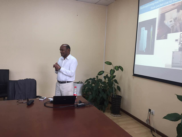Seeram教授深入淺出的介紹了靜電紡絲的原理, 通過修飾和表面改性制備多種類的納米纖維,并展示了其課題組將納米纖維應(yīng)用于生物組織支架、能源儲(chǔ)存、可穿戴電子設(shè)備以及大腦科學(xué)等領(lǐng)域的研究成果。報(bào)告結(jié)束后,Seeram教授對(duì)部分老師和研究生提出的如何開辟新的研究領(lǐng)域等問題做出了詳細(xì)的解答。