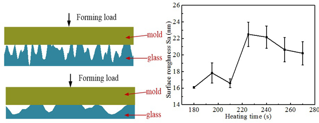 研究團(tuán)隊分析了精密模壓成形玻璃微透鏡陣列過程中界面?zhèn)鳠岈F(xiàn)象,建立了玻璃-模具界面熱阻的計算模型,并對玻璃精密模壓成形中加熱階段這一影響成形精度的重要一環(huán)進(jìn)行了數(shù)值解析,提出了成形過程中壓平效應(yīng)對成形表面粗糙度的演化理論,并通過試驗研究了加熱時間對成形玻璃透鏡表面粗糙度的影響規(guī)律,分析了界面黏接現(xiàn)象的產(chǎn)生原因。