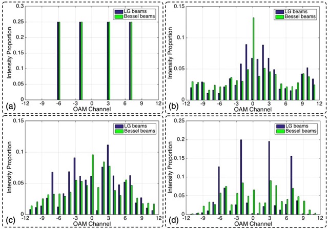渦旋光束是指具有螺旋相位分布的光束,是近年來光學(xué)領(lǐng)域國內(nèi)外學(xué)者研究的熱點之一。渦旋光束攜帶有軌道角動量(orbital angular momentum, OAM),其本征值可取任意整數(shù),不同OAM態(tài)可構(gòu)成一無窮維希爾伯特空間。將光的OAM引入光通信系統(tǒng),可為光通信系統(tǒng)提供一種新的維度,極大提高光通信系統(tǒng)的信息傳輸能力。但是,當(dāng)攜帶有OAM的渦旋光束經(jīng)過大氣湍流等不均勻介質(zhì)傳輸時,會發(fā)生波前畸變,產(chǎn)生OAM譜展寬效應(yīng),進(jìn)而使得系統(tǒng)的誤碼率顯著上升,降低了通信質(zhì)量。為了解決這一問題,該課題組在建立的大氣湍流理論模型基礎(chǔ)上,系統(tǒng)的分析了拉蓋爾高斯光束和貝塞爾高斯光束這兩種最常見的渦旋光束,經(jīng)不同強度的湍流后的OAM譜展寬效應(yīng),受期刊編輯的邀請,研究結(jié)果以 “Influences of atmospheric turbulence effects on the orbital angular momentum spectra of vortex beams”為題,發(fā)表在Photonics Research [Vol. 4, Issue 5, pp. B1-B4 (2016)]上。