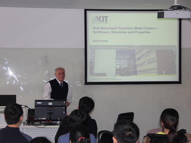 11月28日下午,Dieter Fenske教授在研究生樓5層東側(cè)報告廳做了學術(shù)報告,在介紹了德國Karlsruhe Institute of Technology (KIT)的材料、化學學科建設(shè)基礎(chǔ)上,介紹了他本人課題組在過渡金屬原子簇化合物,主族金屬元素簇合物與納米級團簇化合物從精確解析簇合物晶體結(jié)構(gòu)角度的研究。Dieter Fenske教授所研究的有關(guān)金屬簇合物的原創(chuàng)性成果得到了世界上眾多同行的認可,產(chǎn)生了深遠的影響,發(fā)表Angew. Chem. Int. Ed.、Adv.Mater.等論文490余篇。報告深入淺出,大家爭相提問,現(xiàn)場氣氛熱烈,講座在大家的欲猶未盡中結(jié)束。會后與學院的青年教師李霄羽教授、李紅博教授等進行了深入的學術(shù)討論。