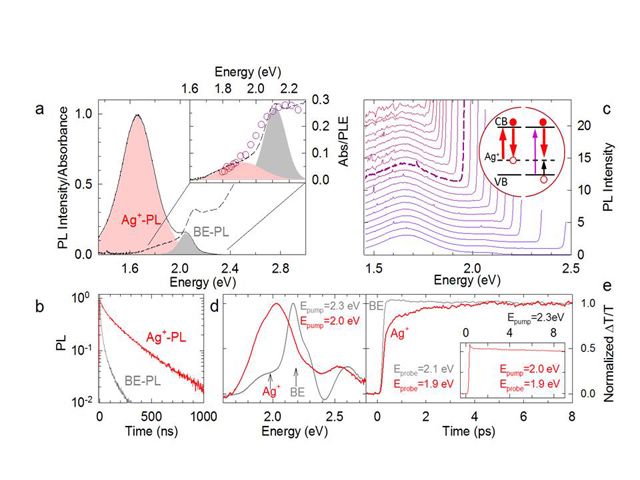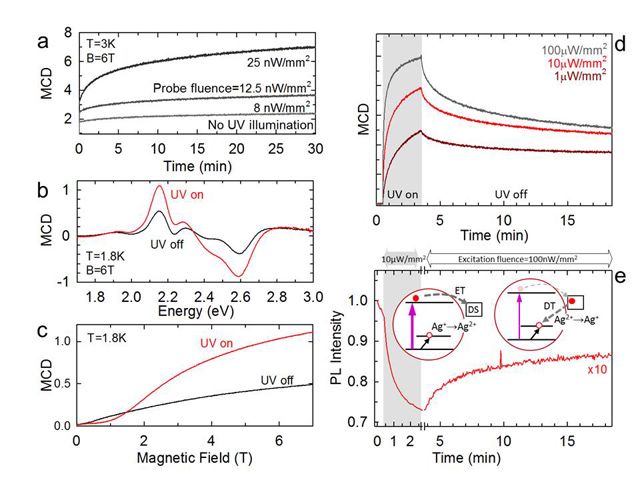 Ag+作為一類新興摻雜元素,常用于III-V族和II-VI族半導(dǎo)體納米材料中。Ag+的摻雜引入帶間能級,并能夠與主體導(dǎo)帶形成光學(xué)耦合。因?yàn)槠?d軌道全滿,所以Ag+是非磁性的。摻雜引起的熒光歸因于光激發(fā)的空穴轉(zhuǎn)移到Ag+之后與導(dǎo)帶電子的復(fù)合。這種光活化過程和Ag+電子構(gòu)型的相關(guān)變化機(jī)理仍不清楚。基于此,北京理工大學(xué)張加濤教授課題組與意大利Brovelli教授課題組合作,全面系統(tǒng)的研究了Ag摻雜CdSe納米晶的激發(fā)衰減過程。他們發(fā)現(xiàn)一個(gè)有趣現(xiàn)象,光生空穴的捕獲致使Ag+轉(zhuǎn)變成順磁性的Ag2+。激子的復(fù)合過程與光誘導(dǎo)磁性有著不可分割的關(guān)系。他們觀察到強(qiáng)烈的光活化磁性和半導(dǎo)體納米材料的稀磁行為。這一研究結(jié)果表明通過非磁性雜質(zhì)摻雜而誘導(dǎo)的激發(fā)過程可以獲得光學(xué)可轉(zhuǎn)換的磁性納米半導(dǎo)體材料。實(shí)現(xiàn)其光、電、磁學(xué)性能有效調(diào)控,促進(jìn)其在光電自旋器件的應(yīng)用!