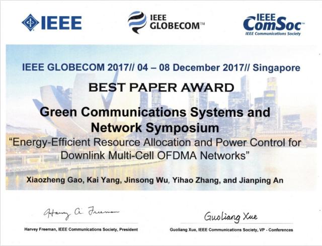 IEEE GLOBECOM是世界通信行業(yè)的兩大頂級(jí)會(huì)議之一,是世界通信行業(yè)規(guī)模最大、最具影響力的標(biāo)志性學(xué)術(shù)會(huì)議,于每年12月中旬定期召開。會(huì)議涵蓋了信息論、認(rèn)知無線電技術(shù)、網(wǎng)絡(luò)安全、無線通信網(wǎng)絡(luò)、光通信網(wǎng)絡(luò)、大數(shù)據(jù)、云計(jì)算、綠色通信、物聯(lián)網(wǎng)等在內(nèi)的通信行業(yè)的各個(gè)領(lǐng)域。IEEE GLOBECOM的最佳論文獎(jiǎng)是通信學(xué)術(shù)界的頂級(jí)大獎(jiǎng)之一,該獎(jiǎng)項(xiàng)長(zhǎng)期被歐美頂尖學(xué)府壟斷。本次大會(huì)從2600余篇投稿中,根據(jù)研究領(lǐng)域評(píng)選出了15篇最佳論文,安建平教授團(tuán)隊(duì)的論文獲得了綠色通信系統(tǒng)與網(wǎng)絡(luò)唯一的最佳論文獎(jiǎng),這是我校首次獲此殊榮。