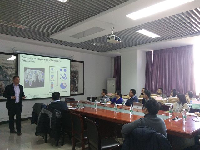 Giannesch教授概述了疾病響應(yīng)傳遞系統(tǒng)的機(jī)制,介紹了通過(guò)開環(huán)歧化聚合的方法制備高功能化的聚合物支架,并將該支架運(yùn)用于人體體內(nèi)探針、多通道成像平臺(tái)以及藥物向靶組織的輸送等方向的研究。講解了液體環(huán)境透射電鏡技術(shù),展示了用其原位觀察液體環(huán)境中納米材料的行為,以及在芯片和液體桿上集成加熱、冷凍元件,用于納米材料功能性測(cè)試。這一先進(jìn)技術(shù)極大地拓寬了透射電鏡的研究范圍。報(bào)告深入淺出,在場(chǎng)師生積極提問(wèn),現(xiàn)場(chǎng)氣氛熱烈。Giannesch教授與李霄羽教授、張加濤教授、陳琪教授等就液體環(huán)境透射電鏡技術(shù)進(jìn)行了深入的學(xué)術(shù)討論,講座在大家的意猶未盡中結(jié)束?!?/p>