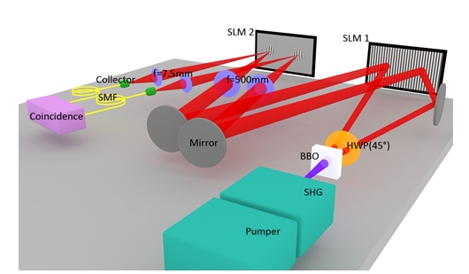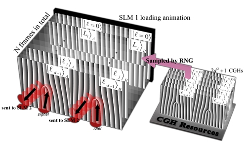 光的軌道角動量自由度由于其天然的高維屬性,自發(fā)現(xiàn)起就被廣泛應(yīng)用于各類高維系統(tǒng)的構(gòu)建中。在實驗中通過光的參量下轉(zhuǎn)換過程產(chǎn)生了軌道角動量光的最大糾纏態(tài)