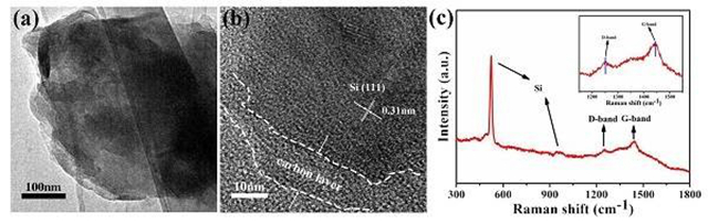 (a) Si/C納米片的TEM;(b) Si/C納米片的HRTEM;(c) Si/C納米片的拉曼光譜圖。