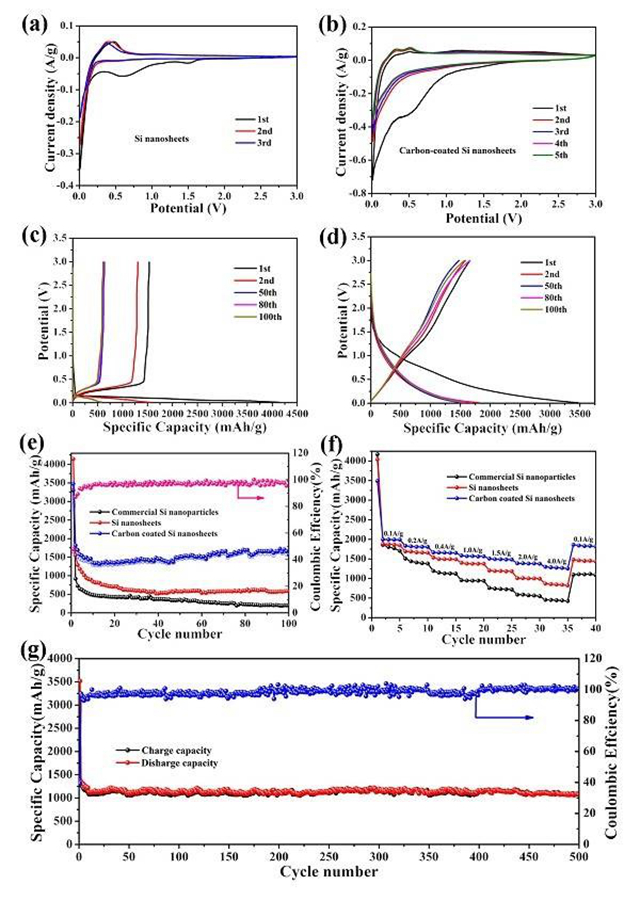 (a) Si納米片前三個(gè)循環(huán)的CV曲線;(b) Si/C納米片前三個(gè)循環(huán)的CV曲線;(c) Si納米片的恒電流充放電曲線;(d) Si/C納米片的恒電流充放電曲線;(e) 400 mAg-1下商 業(yè)硅顆粒、純硅納米片及Si/C納米片的循環(huán)穩(wěn)定性比較;(f) 不同電流密度下商業(yè)硅顆粒、純硅納米片及Si/C納米片的倍率性能比較;(g) 4Ag-1下Si/C納米片的循環(huán)性能。