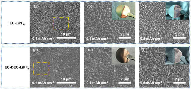 圖2 金屬鋰表面不同結(jié)構(gòu)界面膜對于鋰形核點和晶核生長的影響(a-c為雙層有序結(jié)構(gòu)界面膜,d-f為無序界面膜)