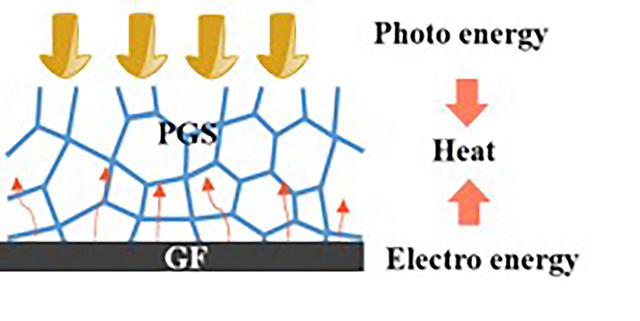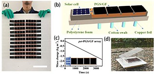 這種石墨烯復(fù)合結(jié)構(gòu)由多孔石墨烯(PGS)和石墨烯箔(GF)組成。PGS部分接收太陽能實(shí)現(xiàn)光熱轉(zhuǎn)換,同時(shí)多孔結(jié)構(gòu)可以提供有效的水蒸發(fā)通道。GF具有較高的導(dǎo)電性并與太陽能電池板連接,在太陽光照射下,太陽能電池板產(chǎn)生電能,GF由于具有較好的電熱性能會產(chǎn)生熱量,進(jìn)而可以提高材料的溫度,有效地提高水蒸發(fā)速率。