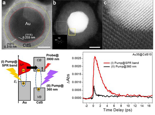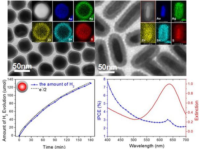 在張加濤教授團隊研究積累的基礎上(Science, 2010; Adv. Mater., 2014; Angew. Chem. Int. Ed., 2015;Nature Nanotechnol. 2018),團隊成員劉佳特別研究員帶領(lǐng)研究生馮靖雯、成曉艷、王虹智等通過發(fā)展水相陽離子交換反應,成功實現(xiàn)對金屬@半導體核殼納米晶形貌、納米結(jié)構(gòu)、異質(zhì)界面的精準合成,在Au@CdS、Au@ZnS以及Au@Ag2ZnSnS4(四元硫族半導體殼層)等核殼納米晶中構(gòu)建了緊密接觸、原子級潔凈的金屬/半導體異質(zhì)界面。根據(jù)飛秒中紅外瞬態(tài)吸收光譜測試及理論計算結(jié)果,Plasmon熱電子從Au核注入CdS導帶的效率高達48%,所合成納米晶在可見光下的光催化分解水制氫性能比傳統(tǒng)方法制備的Au@CdS納米晶提高了2-3個數(shù)量級;將Au@Ag2ZnSnS4納米晶組裝在光化學電極上成膜,利用精準合成的優(yōu)勢調(diào)控納米晶等離子體-激子耦合,在光電催化分解水制氫中獲得了優(yōu)異性能。在已有的異質(zhì)界面能量高效轉(zhuǎn)移等突破性研究基礎上,團隊將結(jié)合表面缺陷調(diào)控等進一步提高光生載流子的利用效率及光催化、光電催化性能。