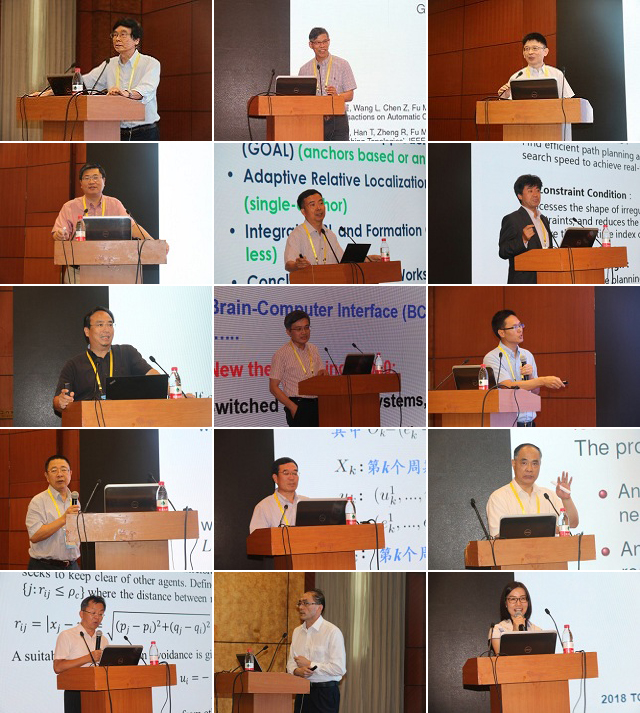 此次研討會共邀請到1位美國工程院院士、中國科學院外籍院士做特邀報告,14位多智能體系統(tǒng)領域的國際知名專家、學者作大會報告,其中IEEE Fellow 14位,IFAC Fellow 7位。此次研討會為與會人員奉獻了15場精彩紛呈的學術報告,涵蓋多智能體系統(tǒng)領域的多個方面,包括群集控制、一致性問題、輸出調節(jié)、協(xié)同動態(tài)規(guī)劃等。香港中文大學C.P. Wong教授介紹了納米材料與技術的最新進展及其在電子、光電子、自動控制系統(tǒng)中的應用。澳大利亞紐卡斯爾大學Minyue Fu教授介紹了一種基于復值拉普拉斯矩陣的多智能體系統(tǒng)可變尺寸編隊控制方法。香港城市大學Gang Feng教授分析了具有無限通訊時滯的多智能體系統(tǒng)一致性問題并提出一種低增益控制方法。美國弗吉尼亞大學Zongli Lin教授對具有執(zhí)行器飽和的單個體系統(tǒng)及多智能體系統(tǒng)的控制問題進行了全面、深入的分析與總結。南洋理工大學Lihua Xie教授介紹了在GPS失效情況下的無人系統(tǒng)的定位與控制問題。新加坡國立大學Shuzhi Sam Ge教授介紹了其在多智能體系統(tǒng)合作動態(tài)規(guī)劃與控制方面的最新研究進展。新加坡國立大學Ben M. Chen教授分享了他帶領的團隊近年來在無人機系統(tǒng)方面的最新進展及工業(yè)應用情況。美國紐約大學Zhong-Ping Jiang教授介紹了小增益理論在動態(tài)網(wǎng)絡系統(tǒng)穩(wěn)定性分析與控制器設計方面的應用。美國加州大學河濱分校Wei Ren教授介紹了其在存在通訊延時及非平衡圖情況下多智能體系統(tǒng)受限一致性與優(yōu)化方面的最新研究進展。中科院數(shù)學與系統(tǒng)科學研究院程代展研究員介紹了布爾網(wǎng)絡的能控性及應用等方面的最新研究成果。中科院數(shù)學與系統(tǒng)科學研究院張紀峰研究員介紹了其在時間非一致性與隨機最優(yōu)控制方面的最新研究進展。香港中文大學Jie Huang教授介紹了線性多智能體系統(tǒng)分布式輸出調節(jié)控制理論與方法。澳門大學的C.L. Philip Chen教授介紹了多智能體系統(tǒng)切換拓撲條件下自動領航-跟隨恒定隊形控制方法。中科院數(shù)學與系統(tǒng)科學研究院洪奕光研究員介紹了多智能體系統(tǒng)的分布式優(yōu)化設計方面的最新進展。香港城市大學Lu Liu教授介紹了異構多智能體系統(tǒng)的分布式協(xié)同控制問題。各位院士、專家、學者的精彩報告受到了參會人員的一致好評,學術交流氣氛熱烈、討論充分。