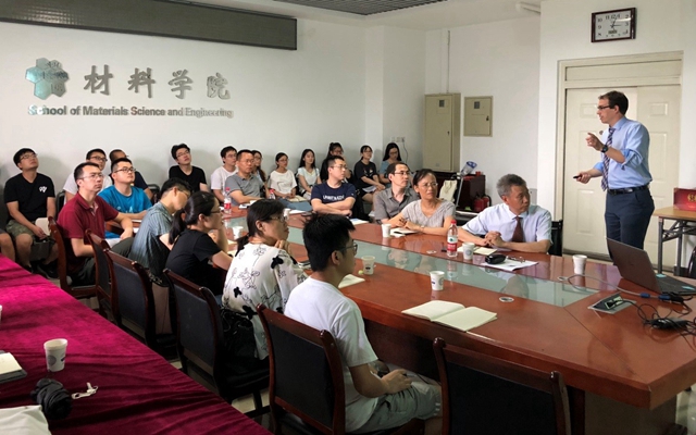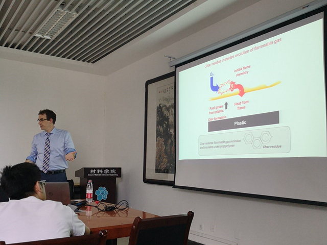7月25日,麻省大學(xué)Amherst校區(qū)國(guó)家高分子研究中心的Todd Emrick教授來(lái)我校材料學(xué)院作題為《Reducing Polymer Flammability with New Designer Synthetic Materials》的講座。新型本質(zhì)阻燃聚合物的合成是Todd Emrick教授課題組的研究方向之一,在不需要添加含鹵阻燃劑或者無(wú)機(jī)阻燃劑的情況下就可以達(dá)到理想的阻燃級(jí)別。教授憑借其淵博的專業(yè)知識(shí)和風(fēng)趣幽默的講授風(fēng)格,深入淺出地講述了羥基、環(huán)氧基和雙鍵在生物基高聚物中的結(jié)合及相應(yīng)的阻燃效果,吸引了眾多感興趣的師生們,會(huì)議室內(nèi)座無(wú)虛席。