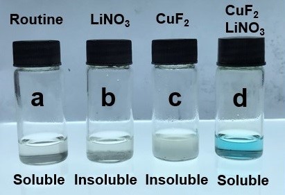 硝酸鋰(LiNO3)作為鋰硫電池電解液的添加劑,在抑制多硫化物的“穿梭效應(yīng)”和保護(hù)金屬鋰負(fù)極上發(fā)揮了重要作用。鋰硫電池電解液體系多為醚類體系,而醚類體系因其窄的電化學(xué)窗口無法使用到高壓電池中(> 4.3 V),酯類電解液體系能夠承受4.3 V及以上電壓。黃佳琦研究員課題組通過引入微量的氟化銅(0.2wt %),最終實現(xiàn)了1.0 wt%硝酸鋰添加劑的溶解,整個溶液的顏色變化明顯:單獨的硝酸鋰和單獨的氟化銅試劑在酯類電解液中均無法溶解;當(dāng)兩者共同加入溶液后,沉淀完全消失,并且呈現(xiàn)藍(lán)色。該藍(lán)色溶液的出現(xiàn),是因為產(chǎn)生了可溶解的銅離子絡(luò)合物(圖1)。