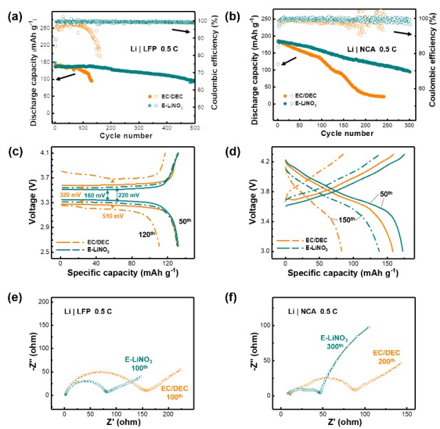 研究者在報道中指認(rèn)了酯類條件下硝酸鋰的初始分解電位在1.4 V,并發(fā)現(xiàn)了其對鋰沉積形貌有明顯影響。含有硝酸鋰的藍(lán)色的電解液溶液被用于匹配以磷酸鐵鋰(LFP)和三元鎳鈷鋁(NCA)為正極,以金屬鋰(Li)為負(fù)極的電池體系中(圖3)。其中,磷酸鐵鋰電池在0.5C倍率下經(jīng)過500次循環(huán)容量保持率維持在83%;高壓鎳鈷鋁電池在0.5C倍率下經(jīng)過300次循環(huán)容量保持率在53%,均呈現(xiàn)出良好的電化學(xué)穩(wěn)定性,新電解液體系下兩種類型電池的阻抗未發(fā)生明顯增大。