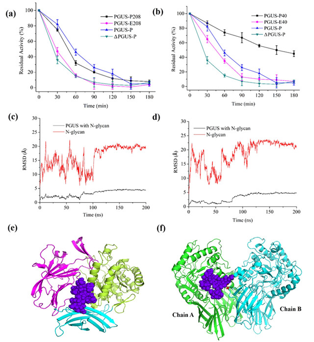 北京理工大學(xué)化學(xué)與化工學(xué)院李春教授課題組在前期完成晶體結(jié)構(gòu)解析的真菌β-葡萄糖醛酸酶(PGUS,同源四聚體結(jié)構(gòu))為模型蛋白,并將其在畢赤酵母(能夠在蛋白質(zhì)的特定位點(diǎn)引入高甘露糖型糖鏈)中異源表達(dá)(PGUS-P),驗(yàn)證了蛋白質(zhì)內(nèi)源的Asn383和Asn594位點(diǎn)的糖基化對(duì)PGUS-P的穩(wěn)定性有顯著影響。通過計(jì)算機(jī)模擬與實(shí)驗(yàn)相結(jié)合的方法,揭示了PGUS-P的兩個(gè)內(nèi)源N-糖基功能類似于“連接臂”,能將空間上距離相近的超二級(jí)結(jié)構(gòu)域相連,使得其局部結(jié)構(gòu)更加緊湊,從而提高了蛋白質(zhì)的整體穩(wěn)定性(圖1)。以此為啟發(fā),研究人員通過對(duì)PGUS的晶體結(jié)構(gòu)分析,在超二級(jí)結(jié)構(gòu)域、結(jié)構(gòu)域、亞基界面間設(shè)計(jì)了N-糖基化位點(diǎn),進(jìn)一步提高了PGUS-P的動(dòng)力學(xué)、熱力學(xué)穩(wěn)定性。酶學(xué)性質(zhì)表征并結(jié)合全原子分子動(dòng)力學(xué)模擬結(jié)果表明,在結(jié)構(gòu)域界面間的Asn208位糖鏈和周圍二個(gè)結(jié)構(gòu)域產(chǎn)生的作用力,形成了“糖橋”構(gòu)型,將蛋白質(zhì)在70°C下的半衰期提高了2.7倍,去折疊自由能提高了8.4 kJ/mol;而在亞基界面間的Asn40位糖鏈通過和相鄰亞基的作用,形成了“糖卡”構(gòu)型,將熱穩(wěn)定性提高了7.1倍,去折疊自由能提高了14.6 kJ/mol,同時(shí)酶的催化效率也提高了1.7倍(圖2)。