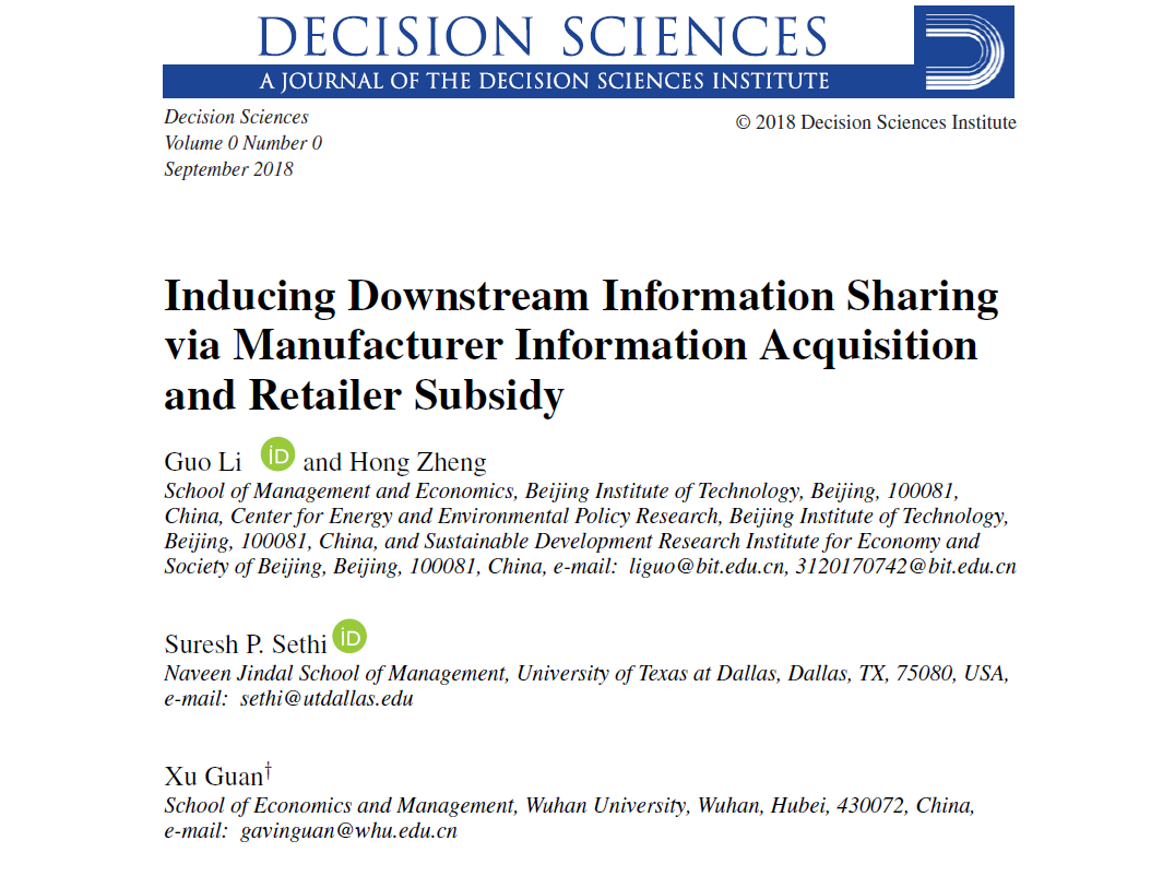 北京理工大學(xué)管理與經(jīng)濟學(xué)院李果教授(第一作者),鄭鴻博士生等合作的研究成果《Inducing Downstream Information Sharing via Manufacturer Information Acquisition and Retailer Subsidy》于2018年10月1日在決策科學(xué)類國際頂級期刊《Decision Sciences》上在線發(fā)表。