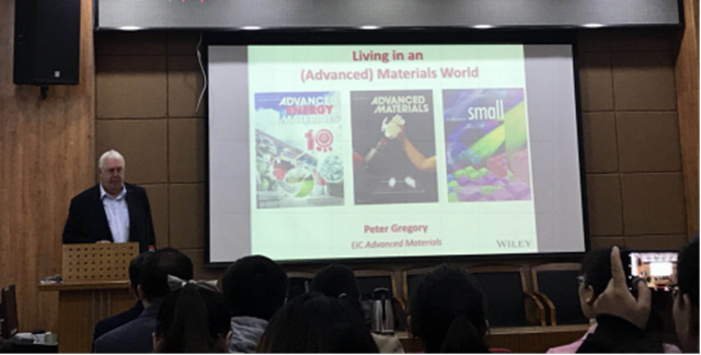 Dr.Peter Gregory簡要介紹了《Advanced Materials》及其姊妹刊的發(fā)展歷程及現(xiàn)狀、世界各地在《Advanced Materials》期刊的投稿及稿件錄用情況,充分肯定了中國科研工作者在學(xué)術(shù)界的貢獻(xiàn)和地位,還高度贊賞了北京理工大學(xué)材料研究及發(fā)表Wiley期刊文章。此外,他還推介了Wiley旗下的新期刊《Advanced Healthcare Materials》《 Advanced Energy Materials》和《Advanced Optical Materials》,并從編輯的角度詳細(xì)介紹了稿件初篩、送審、裁定過程的編輯原則,以及投稿注意事項(xiàng)、如何提高論文投稿的命中率和擴(kuò)大文章學(xué)術(shù)界的影響力。