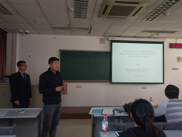 應(yīng)北京理工大學(xué)化學(xué)與化工學(xué)院邀請(qǐng),美國(guó)伊利諾伊大學(xué)香檳分??沙掷m(xù)發(fā)展、能源和環(huán)境研究所的Tong Si博士于2018年11月8日上午來到北京理工大學(xué)化學(xué)與化工學(xué)院,為北理工師生帶來題為“High-throughput microbial engineering using synthetic biology, robotic automation and mass spectrometry ”的學(xué)術(shù)報(bào)告。李春教授主持此次學(xué)術(shù)報(bào)告會(huì),化學(xué)與化工學(xué)院、生命學(xué)院教師及研究生50余人參加了報(bào)告會(huì)。