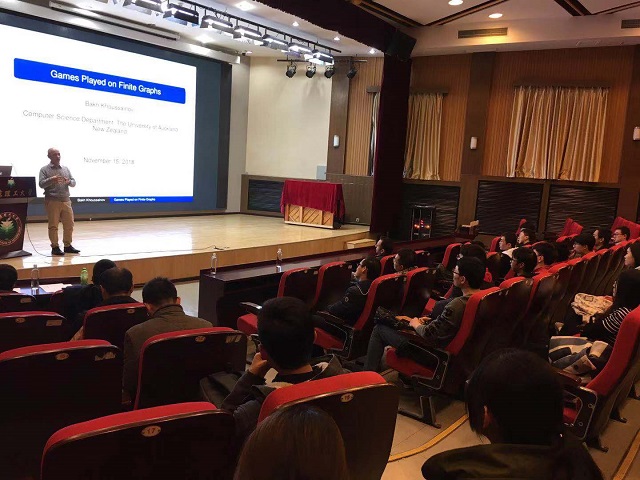 2018年11月16日下午,北理工計(jì)算機(jī)學(xué)院知味講壇邀請(qǐng)到本次計(jì)算機(jī)科學(xué)與技術(shù)學(xué)科合格評(píng)估國(guó)際同行專(zhuān)家評(píng)審組組長(zhǎng)、新西蘭皇家學(xué)會(huì)成員Bakh Khoussainov教授在七號(hào)樓報(bào)告廳作主題為《Games played on finite graphs》的學(xué)術(shù)報(bào)告,計(jì)算機(jī)學(xué)院黨委副書(shū)記、副院長(zhǎng)奚英倫,院長(zhǎng)助理張子劍出席。報(bào)告由奚英倫主持。