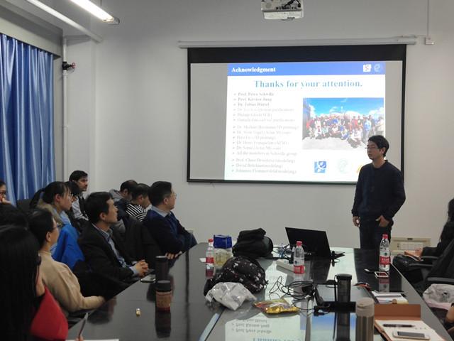 應(yīng)北京理工大學(xué)化學(xué)與化工學(xué)院生化工程系邀請(qǐng),德國(guó)馬克斯普朗克生物化學(xué)研究所的賈海洋博士于2018年12月10日來到北京理工大學(xué)化學(xué)與化工學(xué)院,為北理工師生帶來題為“Light-induced protein assembly in cell-free systems”的學(xué)術(shù)報(bào)告。李春教授主持了此次學(xué)術(shù)報(bào)告會(huì),化學(xué)與化工學(xué)院教師及研究生50余人參加了報(bào)告會(huì)。