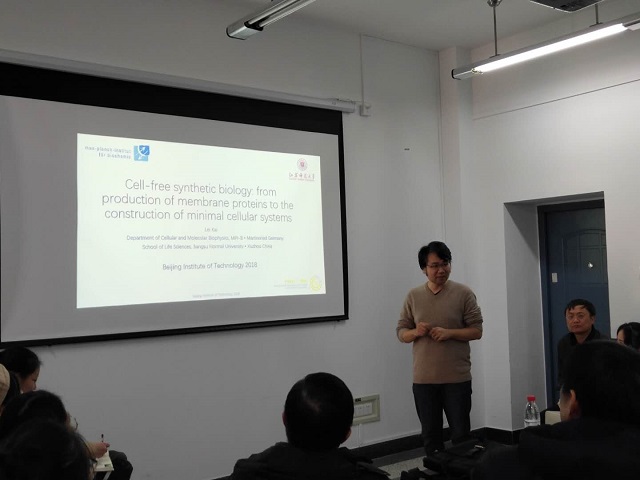 應(yīng)北京理工大學(xué)化學(xué)與化工學(xué)院生化工程系邀請(qǐng),德國(guó)馬克斯普朗克生物化學(xué)研究所的開雷博士于2018年12月29日下午來(lái)到北京理工大學(xué)化學(xué)與化工學(xué)院,為北理工師生帶來(lái)題為“Cell-free synthetic biology: from production of membrane proteins to the construction of minimal cellular systems”的學(xué)術(shù)報(bào)告。李春教授主持了此次學(xué)術(shù)報(bào)告會(huì),化學(xué)與化工學(xué)院教師及研究生50余人參加了報(bào)告會(huì)。
