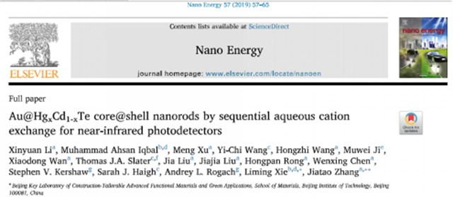 團隊在Au@HgxCd1-xTe金屬/碲化物半導體核殼納米棒的精準合成基礎上,基于殼層材料的窄帶隙特點以及Au納米棒的表面等離子體共振效應,實現(xiàn)連續(xù)可調的可見光-近紅外吸收特性。與國家納米中心謝黎明研究員團隊(光電探測器件表征)、英國曼徹斯特大學Sarah J. Haigh教授(高分辨STEM表征)、香港城市大學Andrey L. Rogach教授(海外名師計劃資助)合作,利用石墨烯高載流子遷移率的特點,實現(xiàn)了石墨烯/Au@HgxCd1-xTe納米棒光電器件的合成。所合成的器件實現(xiàn)了可見光到近紅外寬波段(550-1300 nm)的高光響應效率(~106 A/W)。展示了其在紅外光電探測領域方面的應用價值。相關工作以“Au@HgxCd1-xTe core@shell nanorods by sequential aqueous cation exchange for near-infrared photodetectors”為題發(fā)表在Nano Energy 雜志上(2019, 57, 57-65)。李欣遠博士研究生為論文第一作者。