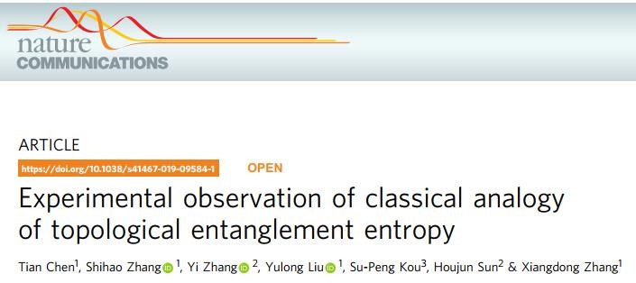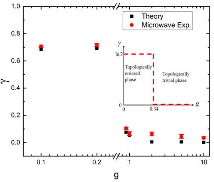 在上述微波信號(hào)處理研究的基礎(chǔ)上,進(jìn)一步開(kāi)展了拓?fù)浼m纏熵方面的研究。拓?fù)浼m纏熵是由Kitaev和文小剛十幾年前在研究拓?fù)湫蚣m纏特性時(shí)提出的一個(gè)物理量。它是能展現(xiàn)出許多新奇物理特性的獨(dú)特物態(tài),具有長(zhǎng)程糾纏特性是其重要特征之一。雖然理論研究顯示拓?fù)浼m纏熵能很好刻畫(huà)拓?fù)湫蚣捌溟L(zhǎng)程糾纏特性,然而一直沒(méi)能得到實(shí)驗(yàn)證實(shí)。