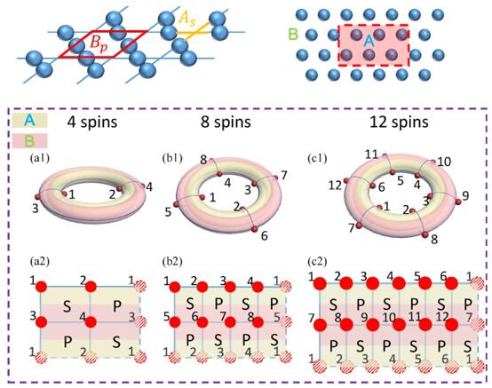 日前,課題組建議一種實(shí)驗(yàn)方案:基于最小熵態(tài)(minimum entropy states)研究拓?fù)浼m纏熵。最小熵態(tài)是可用于觀察拓?fù)湫虻囊环N多qubit糾纏態(tài)(如圖2所示)。通常的做法應(yīng)該是:在量子多體系統(tǒng)構(gòu)建多粒子糾纏態(tài)(量子最小熵態(tài)),然后基于純量子信息處理平臺(tái)進(jìn)行實(shí)驗(yàn)研究。然而,按這種方式執(zhí)行,實(shí)現(xiàn)起來(lái)是非常困難的。原因是要想觀察到拓?fù)浼m纏熵需要多粒子糾纏態(tài)的fidelity至少達(dá)到90%以上,而目前在IBM量子計(jì)算機(jī)平臺(tái)上構(gòu)建的12-qubit糾纏態(tài)fidelity少于44%。