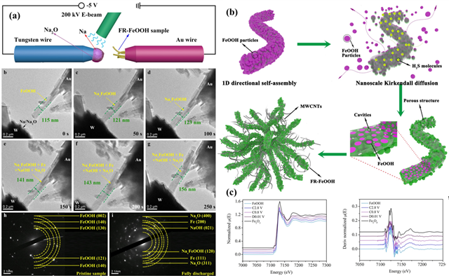 圖1(a)原位TEM分析FeOOH電極的儲(chǔ)鈉過(guò)程中體積形變和儲(chǔ)鈉機(jī)理(b)多孔FeOOH納米棒團(tuán)簇的合成過(guò)程示意圖(c)近邊結(jié)構(gòu)吸收光譜研究FeOOH的儲(chǔ)鈉機(jī)理