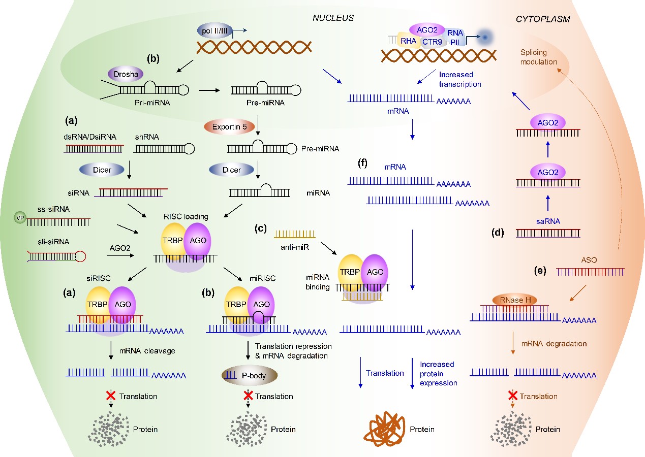 (a)小干擾RNA(siRNA)與(b)微小RNA(miRNA)的作用通路;(c)miRNA拮抗核酸作用機(jī)制;(d)小激活RNA(saRNA)的工作模式;(e)反義核酸(ASO)作用方式;(f)信使RNA(mRNA)療法的特點(diǎn)