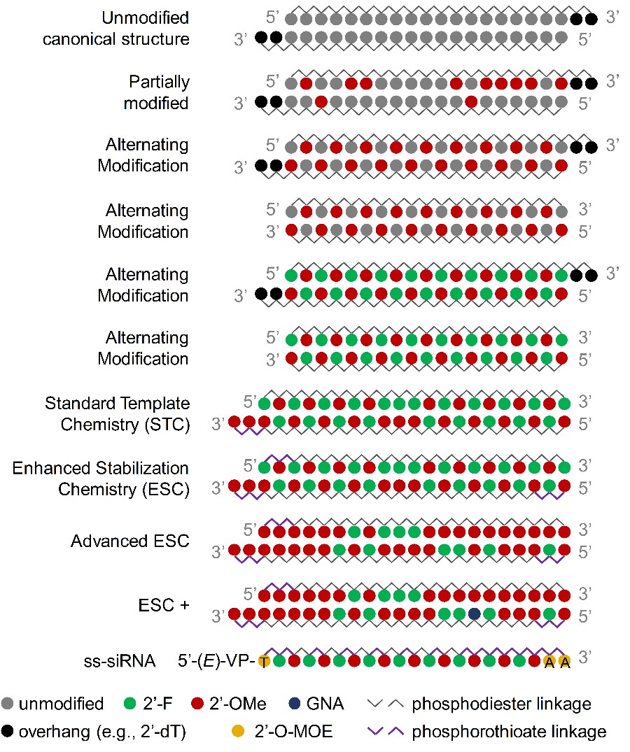 siRNA制藥的關(guān)鍵科學(xué)問題和技術(shù)難題是如何實(shí)現(xiàn)安全高效的體內(nèi)遞送,以及如進(jìn)行精細(xì)的化學(xué)修飾來顯著提高其成藥性。從基礎(chǔ)研究到臨床開發(fā),該領(lǐng)域研究人員設(shè)計(jì)與研究了眾多不同性質(zhì)的藥物遞送系統(tǒng),包括脂質(zhì)體、DPC載體、環(huán)糊精聚合物、多肽、外泌體、GalNAc-siRNA綴合物等。其中脂質(zhì)體、DPC載體和GalNAc-siRNA綴合物均支持了系列siRNA藥物研發(fā)管線的建立和臨床研究。在經(jīng)歷了不斷的技術(shù)演化過程之后,目前本領(lǐng)域主要的制藥公司針對肝細(xì)胞遞送均發(fā)展了GalNAc-siRNA綴合遞送平臺,同時也嘗試針對肺、腎、腦、眼等組織開發(fā)新型遞送系統(tǒng)。與此同時,siRNA的修飾策略是另一項(xiàng)能決定藥物開發(fā)成敗的關(guān)鍵技術(shù)。早期的修飾方案可支持納米化藥物的研發(fā),這是因?yàn)榧{米載體對siRNA有一定的保護(hù)作用,可防止酶的攻擊。近期,更為精細(xì)和考究的siRNA修飾策略,已可支持單次給藥后藥效持續(xù)數(shù)月、甚至一年??傊趕iRNA遞送和修飾方面的技術(shù)演化,始終作為最關(guān)鍵的動力引擎,推動著RNA干擾藥物的研發(fā)。