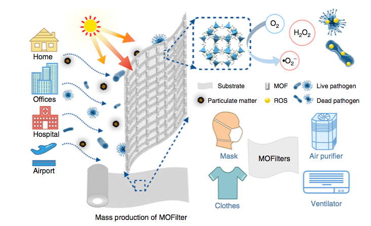 該研究團(tuán)隊(duì)結(jié)合前期的研究工作制備了一系列具有光催化活性的MOFs,篩選了具有超高光催化殺菌活性的ZIF-8,實(shí)現(xiàn)對(duì)水體中大腸桿菌的高效殺滅,殺菌率大于99.9999%。然后利用熱壓法設(shè)計(jì)合成了新型的高效綜合空氣過(guò)濾器(MOFilter),PM微粒捕獲效率能達(dá)到98%以上,同時(shí)還可以殺滅空氣中99.99%的細(xì)菌。機(jī)理研究發(fā)現(xiàn),ZIF-8在太陽(yáng)光催化作用下光生電子產(chǎn)生于LMCT,并且可以有效的活化O2形成?O2–和H2O2,其可以使空氣中的致病細(xì)菌氧化致死。