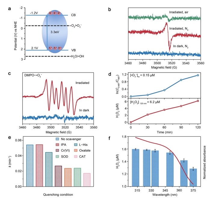 在光催化殺菌機(jī)理方面,通過(guò)UV-vis,M-S和VB-XPS確定了材料的能帶結(jié)構(gòu),從理論上預(yù)測(cè)了可以產(chǎn)生?O2–,但不能產(chǎn)生?OH。而在實(shí)驗(yàn)過(guò)程中我們也通過(guò)一些常規(guī)的表征手段,比如EPR、紫外吸收、熒光光譜等方法檢測(cè)了材料在光照條件下產(chǎn)生的自由基,其結(jié)果與理論預(yù)測(cè)一致。自由基的捕獲實(shí)驗(yàn)證明光催化過(guò)程中產(chǎn)生的?O2–和H2O2起了主要的殺菌作用。通過(guò)測(cè)試材料在77k下不同氣氛條件下的固體EPR證明了光生電子是由配體轉(zhuǎn)移到金屬(LMCT),然后活化空氣中的氧生成?O2–以及相關(guān)的H2O2。
