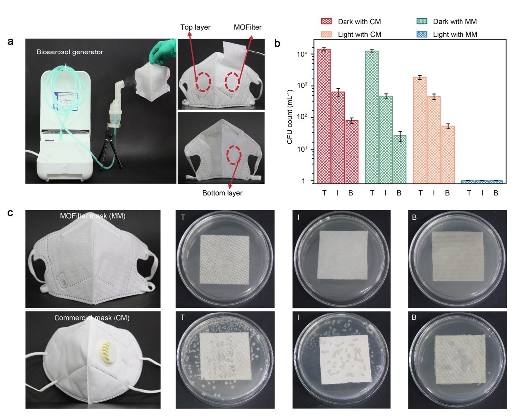 為了實(shí)現(xiàn)個(gè)人防護(hù)功能,作者開(kāi)發(fā)了一款基于MOFilter的個(gè)人防護(hù)用品(MOFilter口罩)。通過(guò)噴灑微生物氣溶膠模擬真實(shí)使用場(chǎng)景,然后分別檢測(cè)MOFilter口罩三層的細(xì)菌存活率,光照30min,MOFilter口罩三層均沒(méi)有細(xì)菌存活。同時(shí)和商用的N95口罩做了對(duì)比,相同條件下,商用口罩殘留大量的活菌。在此實(shí)驗(yàn)結(jié)果基礎(chǔ)之上,作者也將ZIF-8熱壓在真絲布上,用于加工制備自清潔衣物。這項(xiàng)研究成果在個(gè)人防護(hù)方面具有極高的應(yīng)用前景。