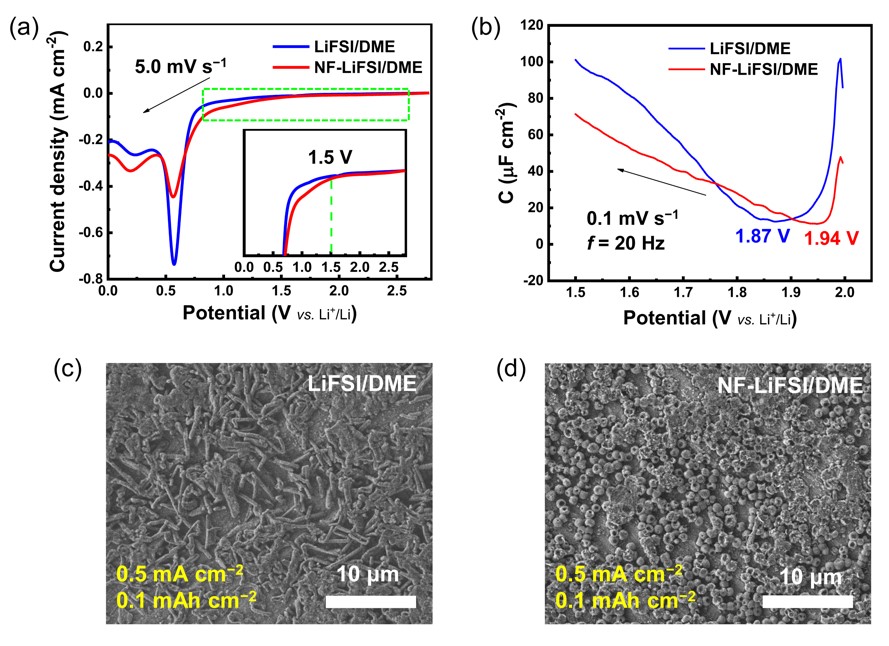 黃佳琦課題組在保持電解液體相具有一致鋰離子溶劑化結(jié)構(gòu)前提下,把研究重點(diǎn)聚焦在內(nèi)亥姆霍茲層的特性吸附方面。首先采用模擬計(jì)算推測(cè)出硝酸根(NO3?)陰離子在硝酸根(NO3?)、氟離子(F?)、雙氟亞胺離子(FSI?)和乙二醇二甲醚(DME)等多種組分競(jìng)爭(zhēng)環(huán)境下的優(yōu)勢(shì)吸附特性,并通過非法拉第過程和法拉第過程的電化學(xué)實(shí)驗(yàn)進(jìn)行了驗(yàn)證(圖2)。結(jié)合HADFF-STEM及XPS深度濺射分析技術(shù)關(guān)聯(lián)了特性陰離子吸附對(duì)SEI形成過程及對(duì)鋰沉積形貌的影響,發(fā)現(xiàn)NO3?誘導(dǎo)產(chǎn)生的SEI無機(jī)組分主要以氮氧化鋰(LiNxOy)為主,該SEI界面能夠促進(jìn)金屬鋰的球狀沉積,提高金屬鋰的循環(huán)利用率;而FSI?誘導(dǎo)產(chǎn)生的SEI無機(jī)組分主要以LiF形式存在,該SEI易誘導(dǎo)金屬鋰的枝晶狀沉積。