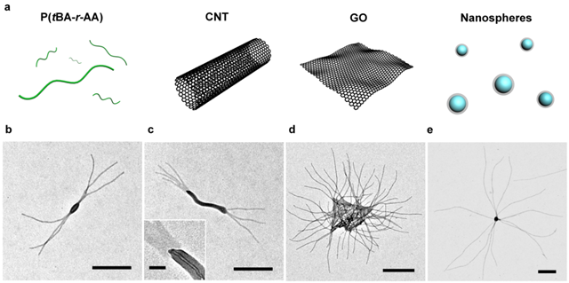作者進(jìn)而探索了這些超分子聚合物在加熱條件下的解離和降溫后重新組裝的過程,證明其聚合度完全由組裝條件所決定,并可通過調(diào)節(jié)實驗參數(shù)使得超分子聚合物在不同長度之間互相轉(zhuǎn)換。此外,作者還研究了多種其他小分子引發(fā)劑,它們可分別與聚合物形成氫鍵,鹵鍵,季銨化物和金屬配位鍵等多種超分子作用。通過簡單的加熱-降溫過程,所有引發(fā)劑都可以通過一鍋法制備出長度均一的柱狀膠束,且引發(fā)劑的種類可以顯著影響膠束長度。更有趣的是,作者發(fā)現(xiàn)不僅可以使用小分子作為引發(fā)劑,在使用大分子或納米顆粒作為引發(fā)劑時,可以制備出尺寸可控的分支形、嵌段形、毛刷狀或星形多級納米結(jié)構(gòu)(具有多種拓?fù)浣Y(jié)構(gòu)的超分子聚合物)。