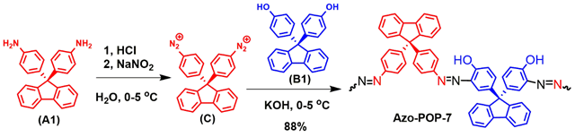 然而,目前報(bào)道的大部分有機(jī)多孔聚合物不熔融不溶解,一定程度上限制了其進(jìn)一步應(yīng)用。因此,從分子鏈的扭曲構(gòu)象出發(fā),以“逆合成”的思路選擇合適的聚合物單體和高效的聚合反應(yīng),制備新型的可溶性有機(jī)多孔聚合物材料,對推進(jìn)有機(jī)多孔聚合物材料領(lǐng)域的研究具有重要意義,也成為一個(gè)研究熱點(diǎn)。最近,黃木華課題組利用重氮偶聯(lián)反應(yīng),從具有扭曲構(gòu)象的9,9-二(4-羥基苯基)芴和9,9-二(4-胺基苯基)芴單體出發(fā),實(shí)現(xiàn)了偶氮鍵鏈接的可溶性有機(jī)多孔聚合物材料Azo-POP-7的快速制備(圖1)。