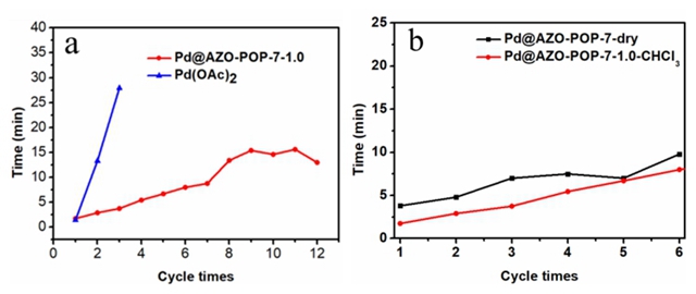 此外,Pd@Azo-POP-7具有優(yōu)異的循環(huán)催化性能。在相同的反應(yīng)條件下,以醋酸Pd作為反應(yīng)的催化劑,只能進(jìn)行3次循環(huán)催化。而以Pd@Azo-POP-7作為催化劑時(shí),催化反應(yīng)可以進(jìn)行12次以上,仍然保持很高的催化活性(圖4)。這主要?dú)w功于Azo-POP-7的羥基偶氮官能團(tuán)與金屬Pd間存在配位作用,很好地分散了Pd納米粒子,防止聚集,并防止其流失。該工作為制備可溶性有機(jī)多孔聚合物材料提供了新的思路,拓展了有機(jī)多孔聚合物在兩相催化中的應(yīng)用。